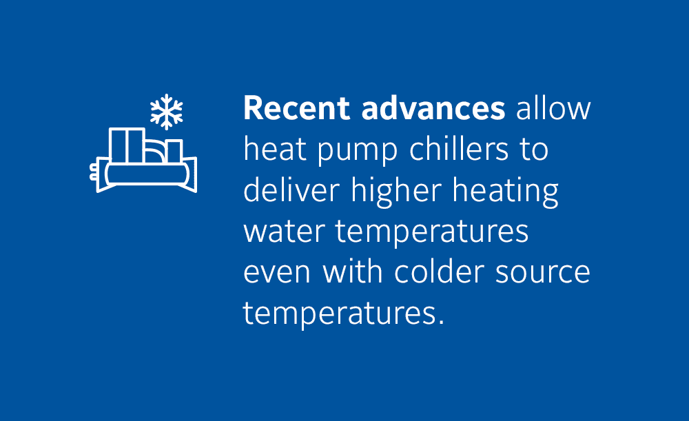 Using electric HVAC systems like heat pump chillers to keep buildings warm, instead of traditional boilers and furnaces, could cut global CO₂ emissions by 3 gigatons per year¹ if implemented worldwide. Today’s heat pump chiller models are ideal for commercial building electrification, with recent advances that allow heat pump chillers to deliver higher heating water temperatures with colder source temperatures. Even chilled water systems that aren’t required to provide heating can provide significant building electrification benefits thanks to greater system efficiencies than older, traditional units.