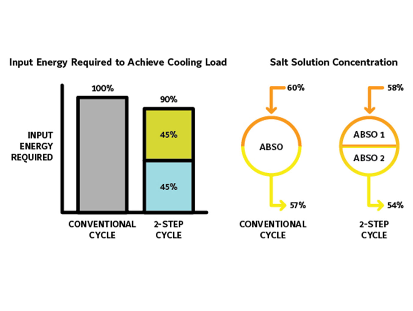Zusätzlich mit dem 2-stufigen Verdampfer-Absorber kombiniert verwendet dieses Design eine geringere Lösungskonzentration. Dadurch kann eine niedrigere Antriebstemperatur für einen hohen COP sorgen.